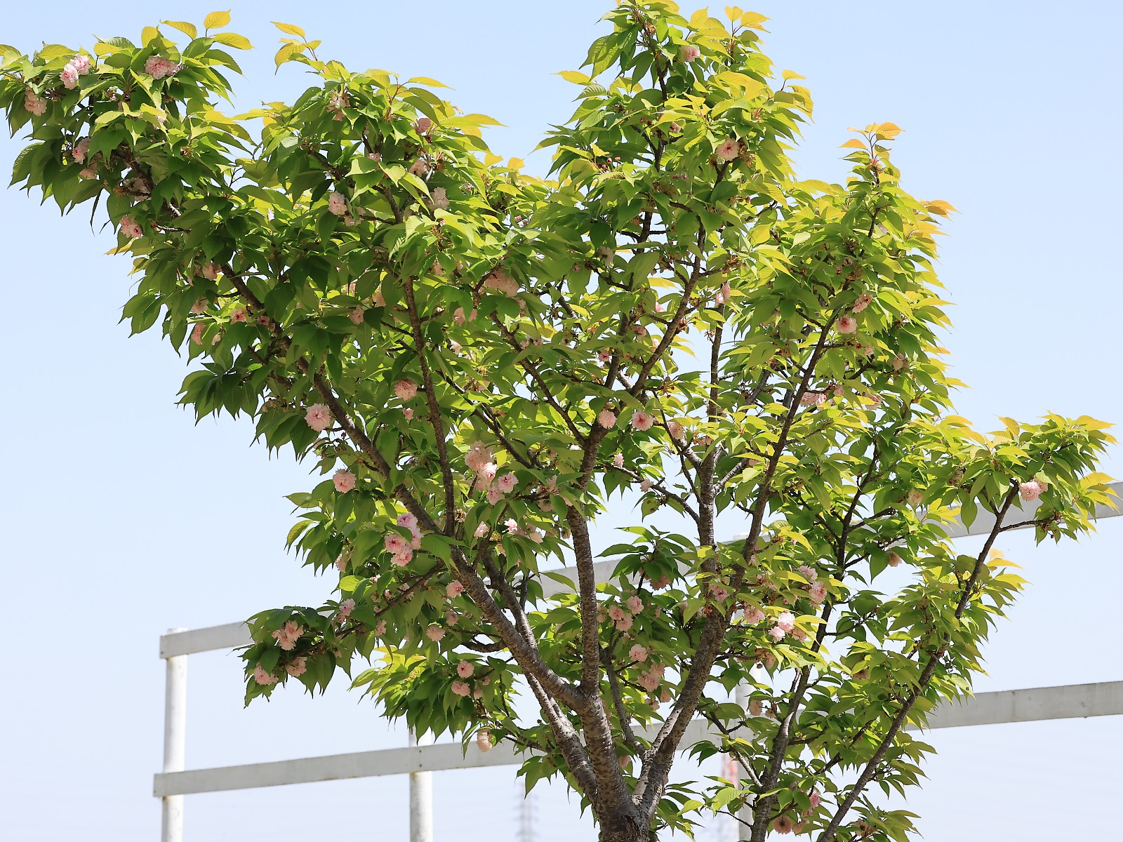 MEMO: 開花したばかりの兼六園菊桜の全体像ですが、見ての通り、 緑色の若葉が生い茂っており、花はその葉陰にひっそりと咲いている状態で、 花単体では豪華なのですが、全体像では豪華さは全く感じられない姿です
