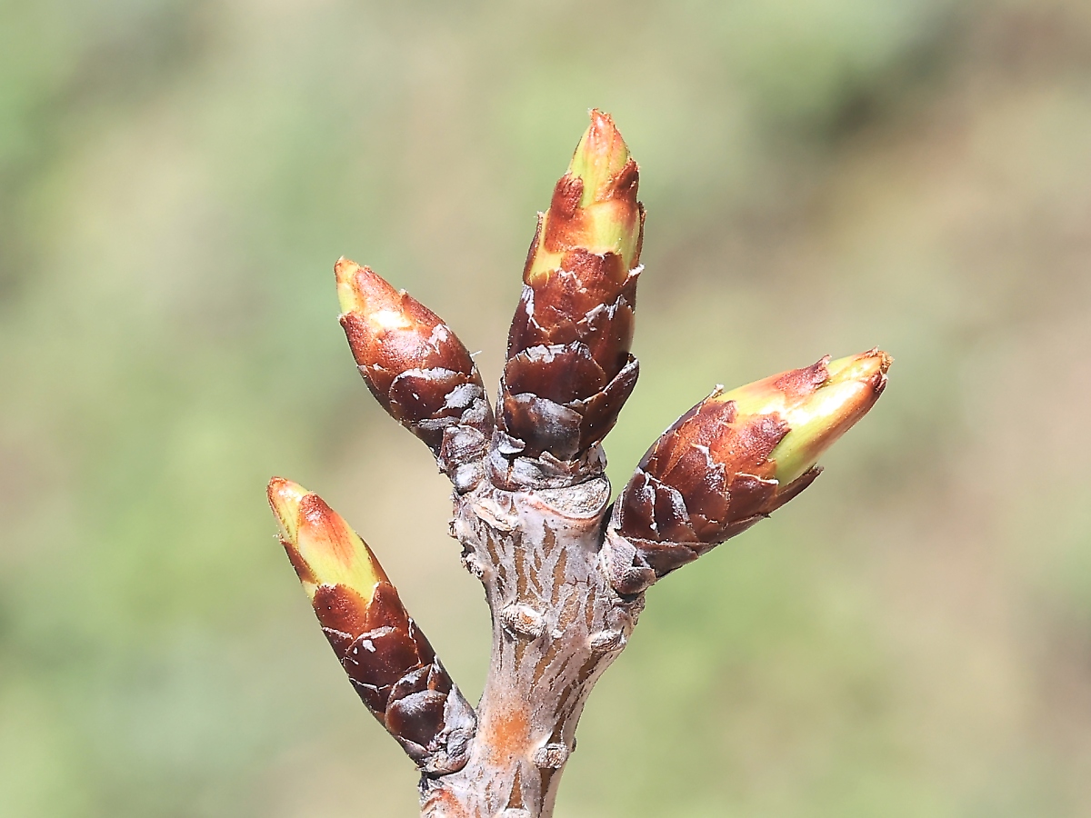MEMO: 冬芽が膨らみ、先端が割れ、先端に黄緑色や紅色が見え始めた状態で、 左右の2つは花芽で、中央と左下の尖った冬芽は葉芽と思われます