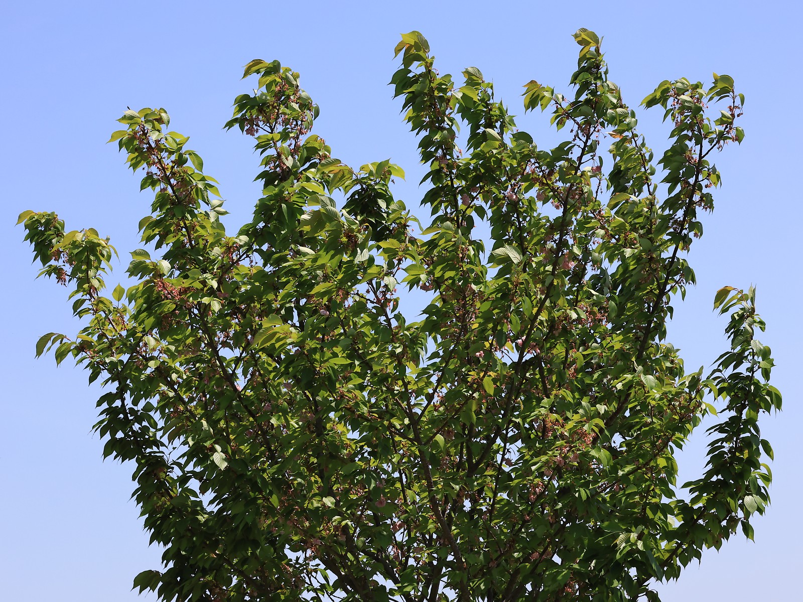 MEMO: 花時期も終わりを迎えた紅華の全体像で、 緑色の若葉が茂ってきており、葉桜へと変わりつつある姿です