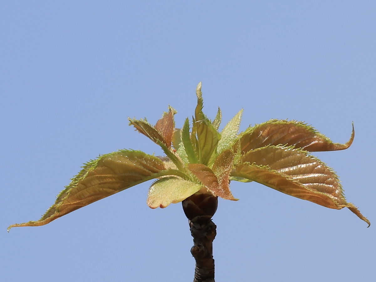 MEMO: 琴平は蕾とほぼ同時に若葉が出始めますので、開花する頃には このように若葉が開き始め、花と葉が共存する姿となります