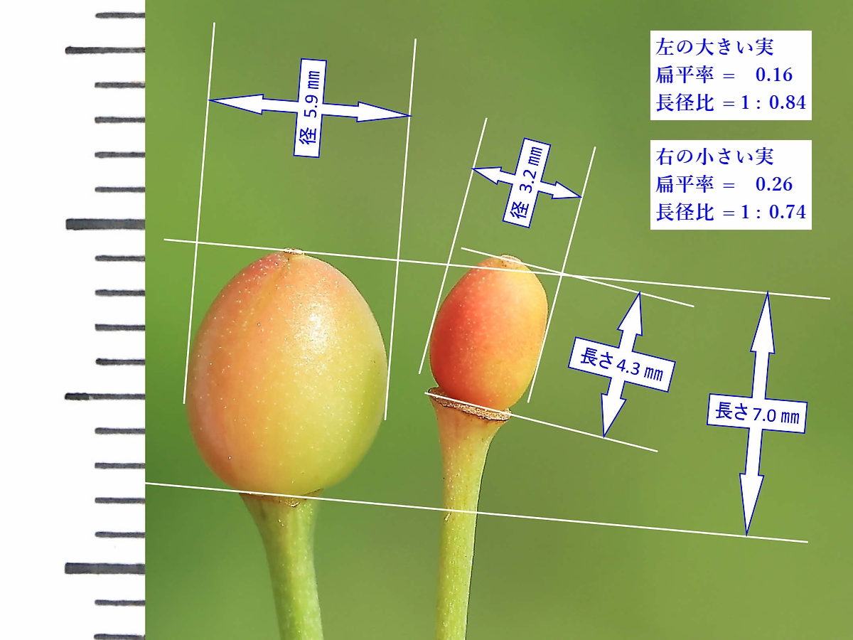 MEMO: 結実約2週間後の琴平の実の大きさを計ったもので、大きい実の 長さが 7.0 ㎜で、径が 5.9 ㎜で、扁平率が 0.16 とかなり球形に近い形となって、 色も赤みを帯びてきており、完熟に近づいているがこのまま育つかが心配です