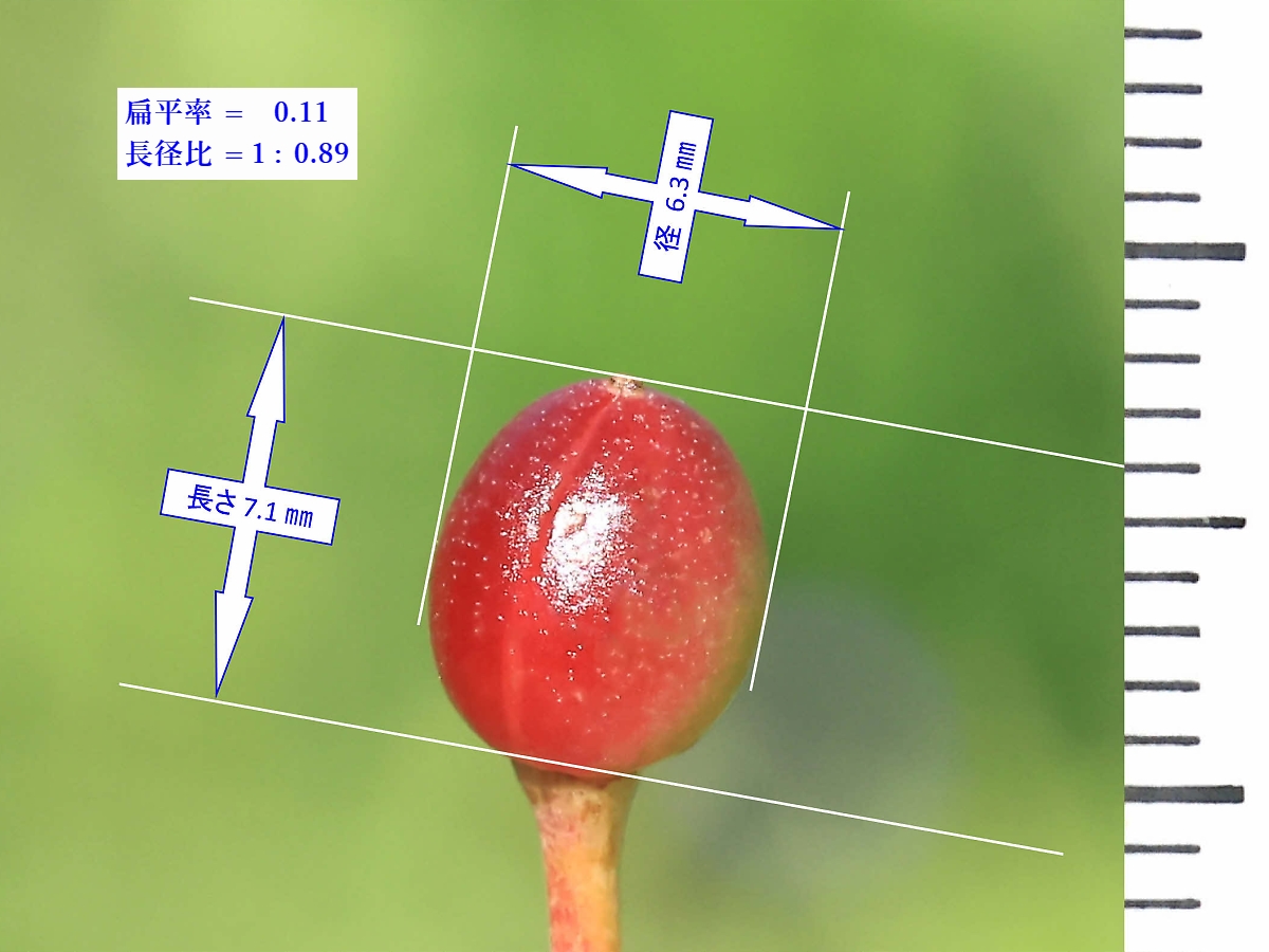 MEMO: 結実約4週間後の琴平の実の大きさを計ったもので、 長さが 7.1 ㎜、径が 6.3 ㎜で、扁平率が 0.11 と1週間前から ほとんど成長していないが、全体が赤くなっており今後に期待です