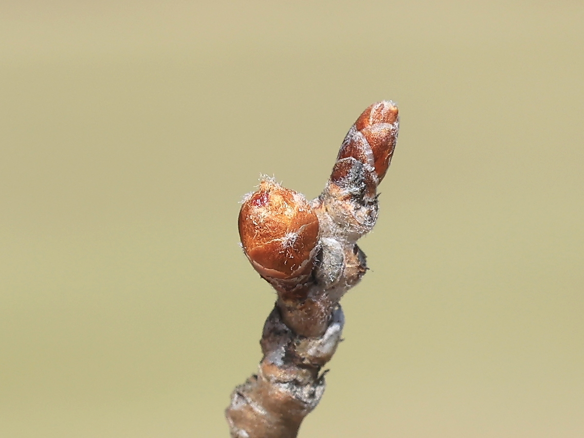 MEMO: 冬芽の膨らみが増し、左手前の花芽は先端が割れて 蕾が顔を出しているようで、まもなく蕾が出始めると思われる状態です