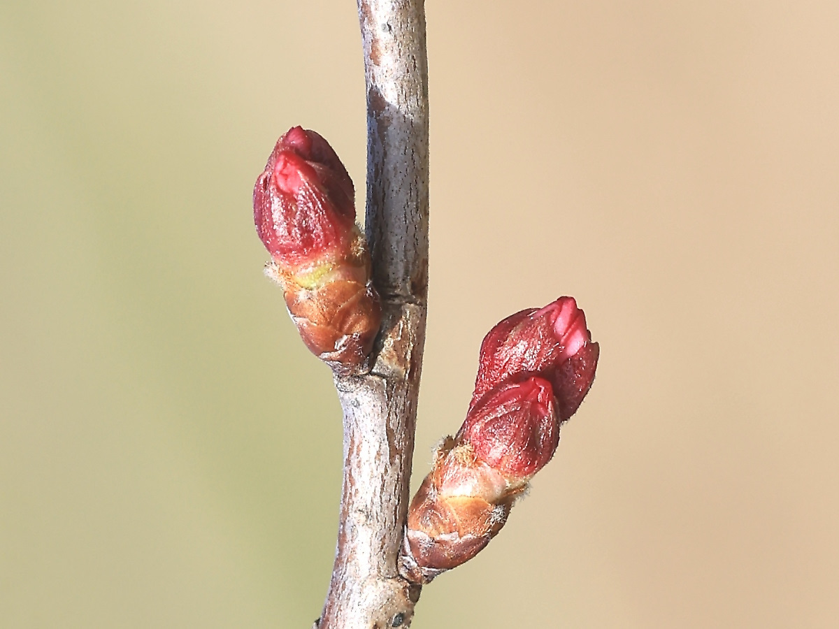 MEMO: 花芽の先端が割れ、中から2個蕾が出揃ったところで、 蕾の先端からは紅色の花弁も出始めている状態です