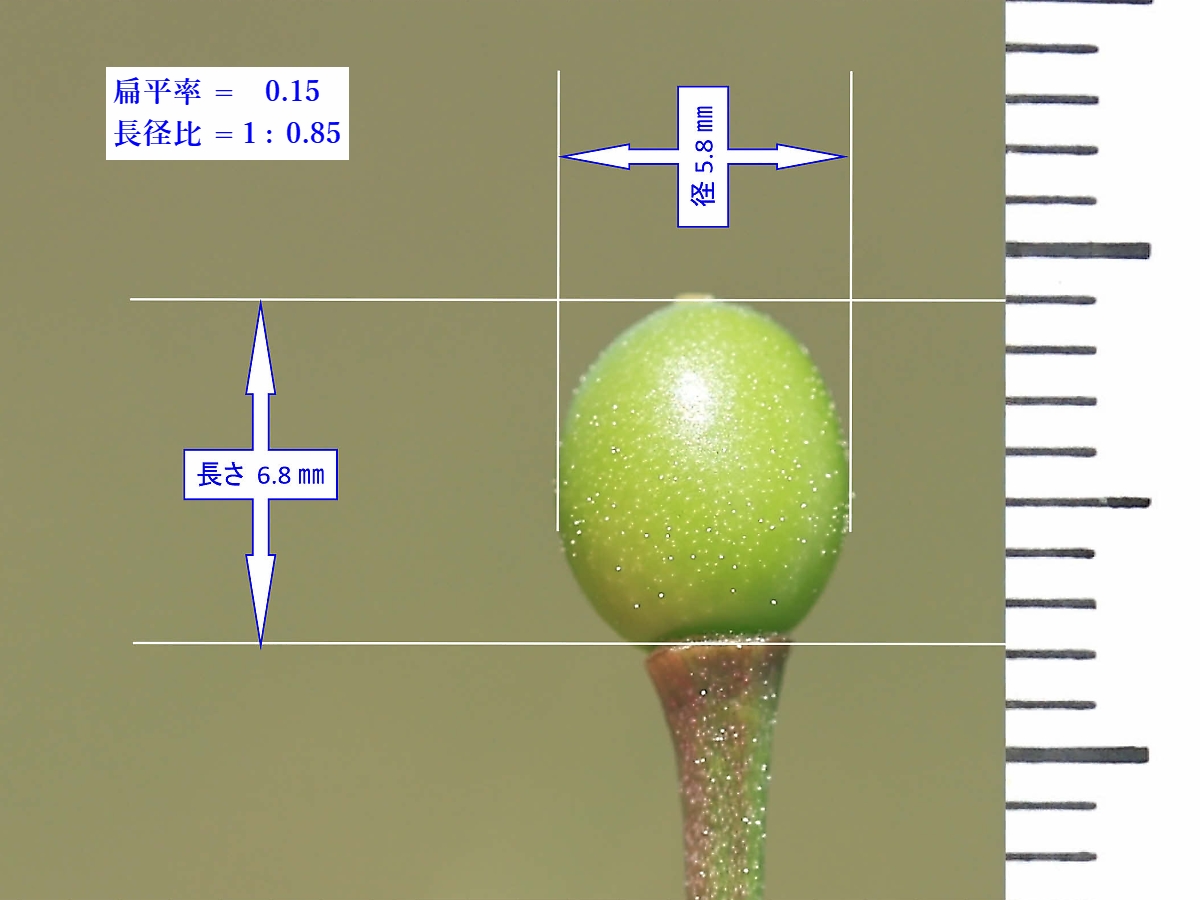 MEMO: 結実して間もない頃の佐野桜の実で、 長さが 6.8 ㎜で、径が 5.8 ㎜で、扁平率も 0.15 と球形に近い形で、 できたばかりからこのように球形に近いのが佐野桜の実の特徴です