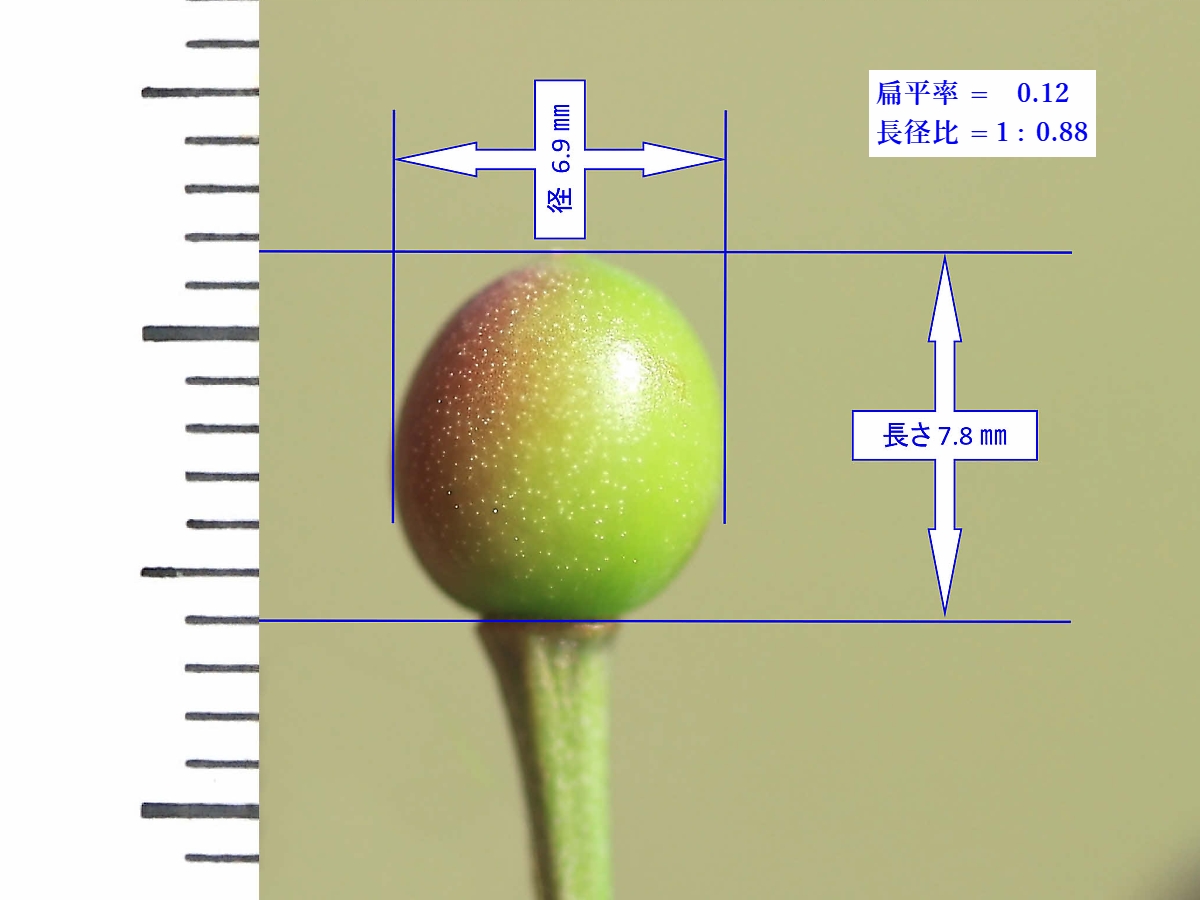 MEMO: 結実して約10日ほど経過した佐野桜の実で、長さが 7.8 ㎜、径が 6.9 ㎜で、 扁平率も 0.12 と球形にかなり近い形で、わずかに色付き始めてきたところです
