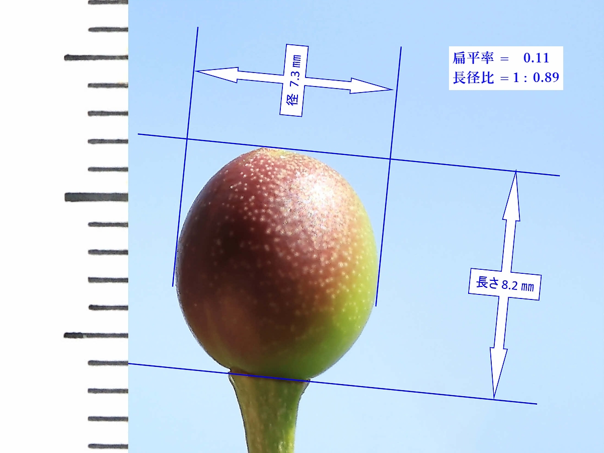 MEMO: 結実して約2週間後の佐野桜の実で、長さが 8.2 ㎜、径が 7.3 ㎜で、 扁平率も 0.11 とほぼ球形になり、色付き始めてきたところです