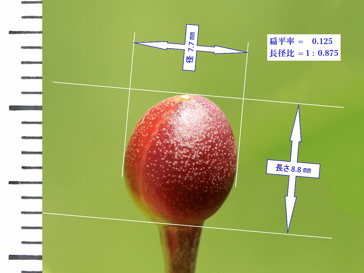 MEMO: 結実して約3週間後の佐野桜の実で、長さが 8.8 ㎜、径が 7.7 ㎜で、 1週間前からほんの少し大きくなり、全体が赤くなってきた状態です
