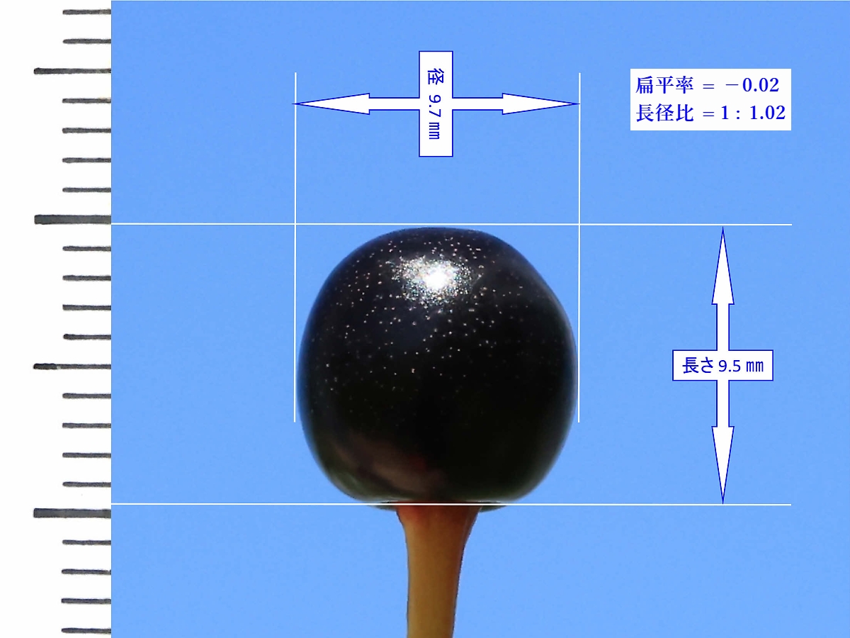 MEMO: 結実して約1ヶ月後の佐野桜の実の大きさを計ったもので、 長さが 9.5 ㎜、径が 9.7 ㎜で、扁平率が -0.02 と長さより径の方が 大きくなり、とても整った形をしており、真っ黒に完熟した状態です