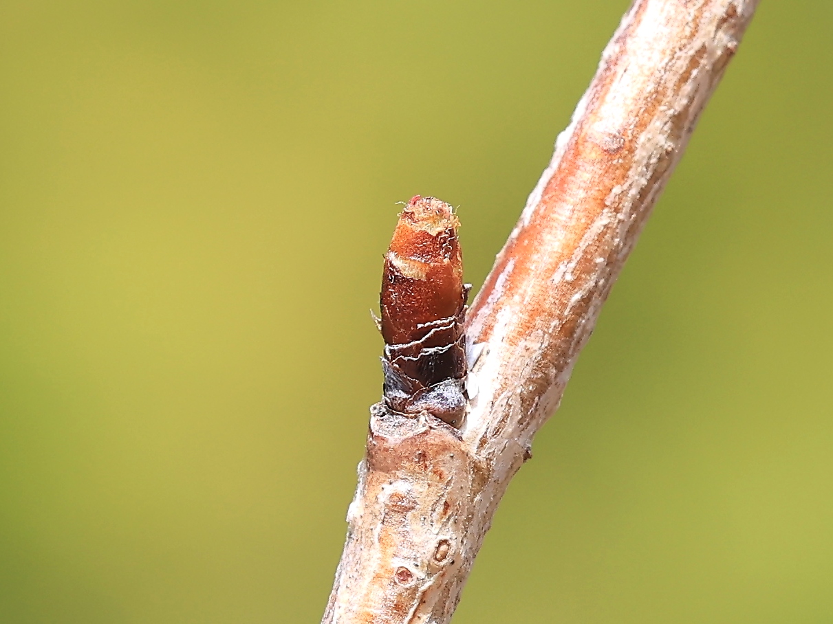 MEMO: 十月桜の春咲きの冬芽で、膨らみ始めたところで、 先端が割れ黄緑色や紅色が見え始めている状態です