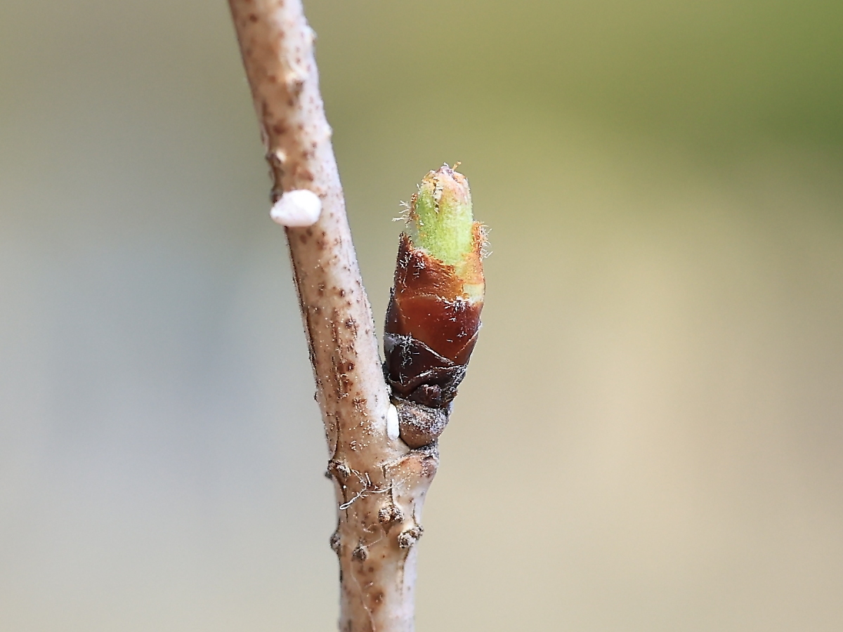 MEMO: 十月桜の春咲きの冬芽とはっきりわかる状態で、膨らみ始めた ところで、先端が割れ恐らく葉と思われる黄緑色が見え始めている状態です
