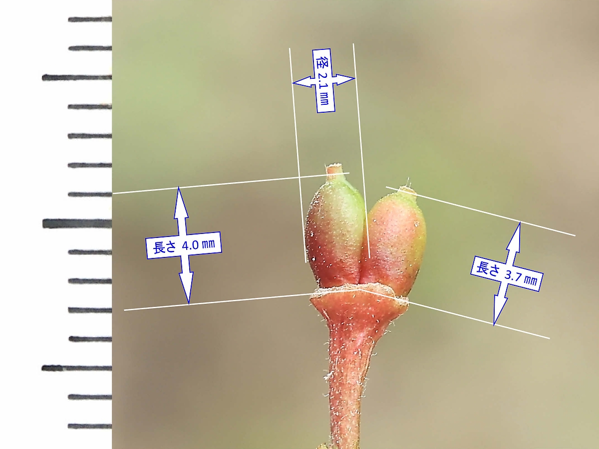 MEMO: 結実したばかりの十月桜の双子の実の大きさを計ったもので、 長さが 4.0 ㎜と 3.7 ㎜で、径が 2.1 ㎜ととても小さくて可愛い実ですが、 この大きさで少し赤く色づいており、まもなく落果してしまうと思われます