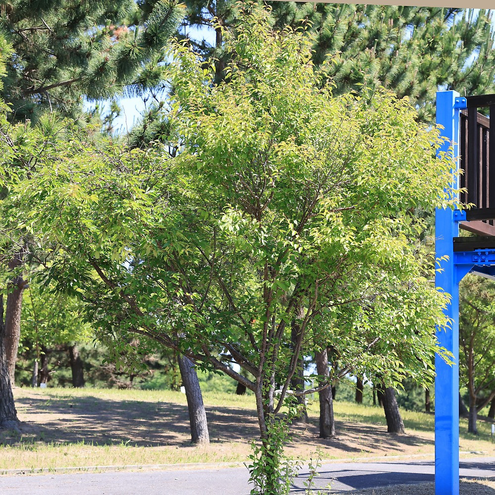 MEMO: 植栽9年目の十月桜で、樹形は傘状で、樹高は 3.2 mと 植栽9年目で3m 越えは、順調に成長している状態です