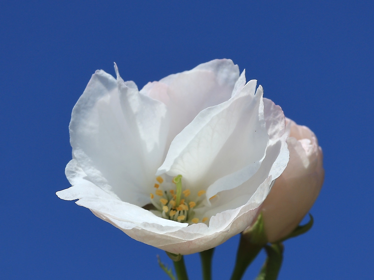 MEMO: 開花したばかりの朱雀で、一重咲きの大輪で、花色は白色又は淡紅色で、 大輪の花が枝いっぱいに咲き誇る姿はとても見ごたえがあります