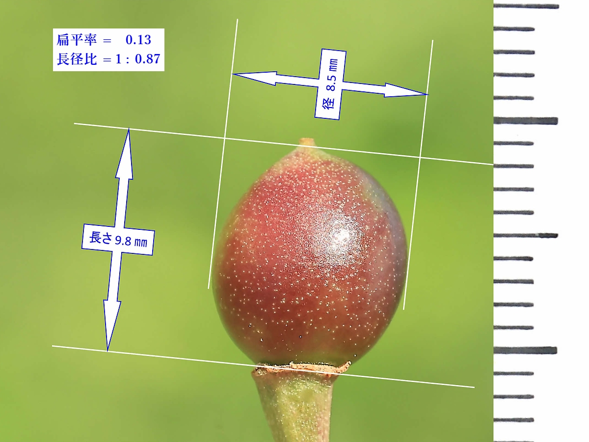 MEMO: 結実して約2週間後の朱雀の実の大きさを計ったもので、長さが 9.8 ㎜、 径が 8.5 ㎜で、扁平率が 0.13 と球形に近い形で、色付き始めた状態です