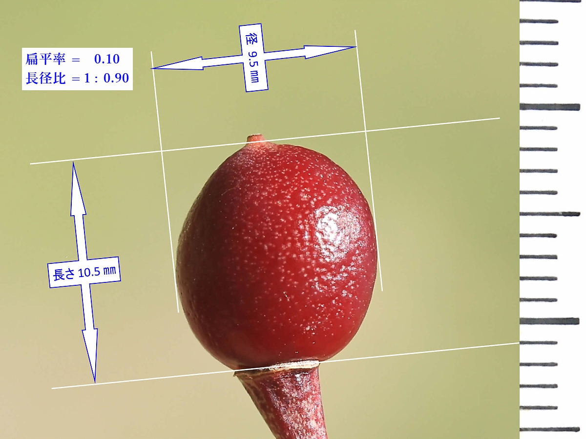 MEMO: 結実して約1ヶ月半後の朱雀の実の大きさを計ったもので、長さが 10.5 ㎜、 径が 9.5 ㎜で、扁平率が 0.10 と球形に近くなり、色も暗赤色になってきた状態です