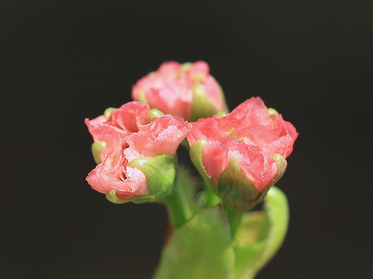 MEMO: 花芽から蕾が3個出揃ったところで、松月特有の 萼が紅色の花弁をがっちりと捕まえている姿はとても印象的で、 このような蕾を持つ花は、葉化雌しべを持っているものがほとんどです