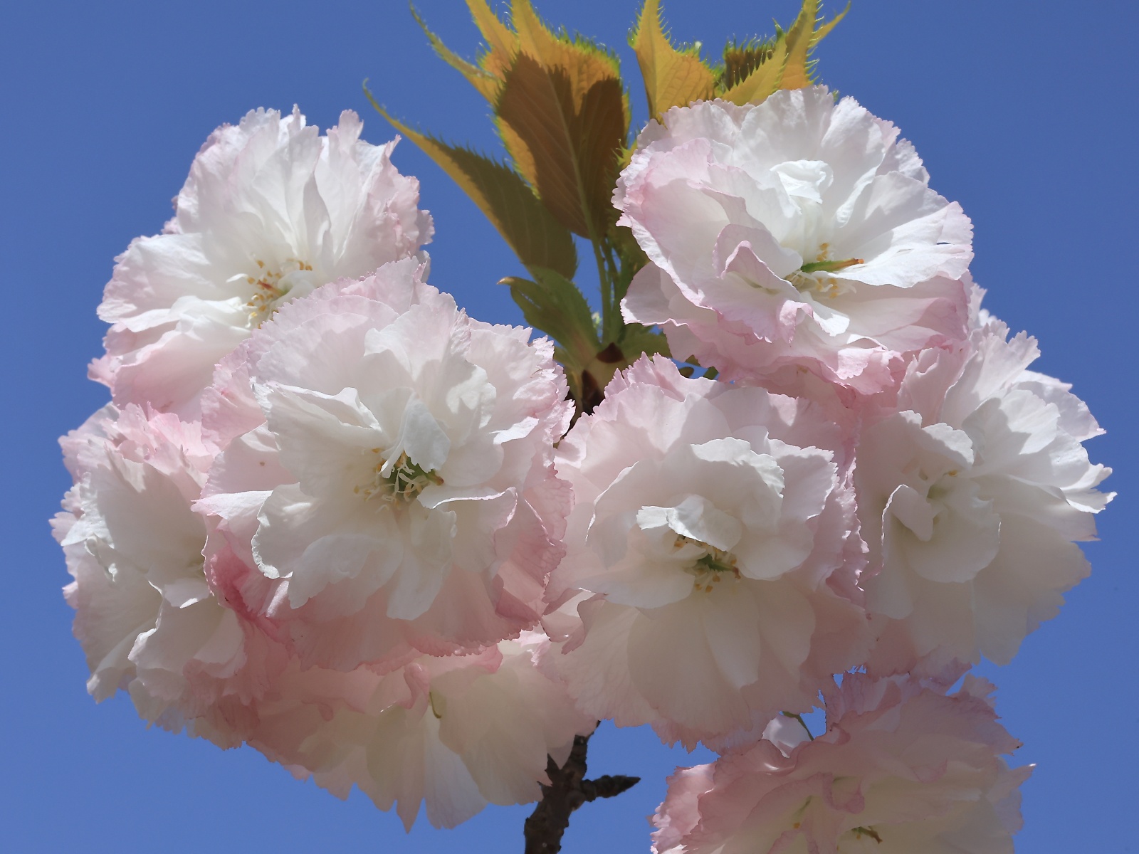 MEMO: 満開時期を迎えた松月で、八重咲きの大輪で、淡紅色の花が このように集まって咲くさまは、とても美しく美種に相応しい花姿です