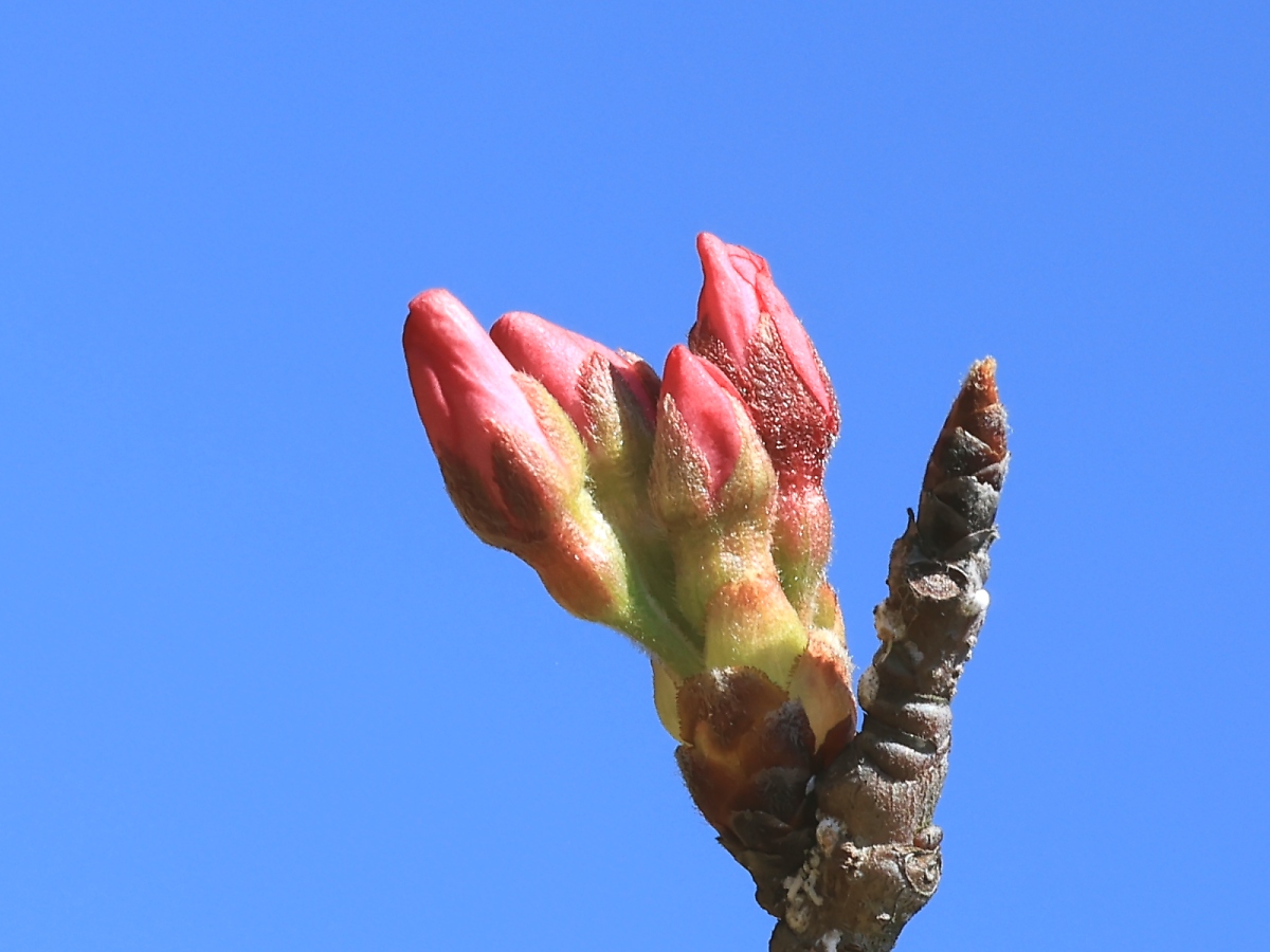 MEMO: 蕾が出揃った状態で、紅色の花弁も出ており、 開花が近い状況で、この花芽からは4個の蕾が出ており、 一つの花芽から多くの蕾が出るのが神代曙の特徴です