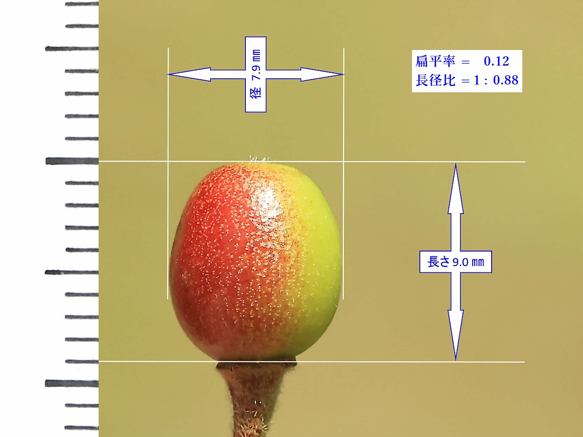 MEMO: 神代曙の結実約1カ月後の実の大きさを計ったもので、長さが 9.0 ㎜、 径が 7.9 ㎜で、扁平率が 0.12 と球形に近い形になり、少し色付き始めた状態です
