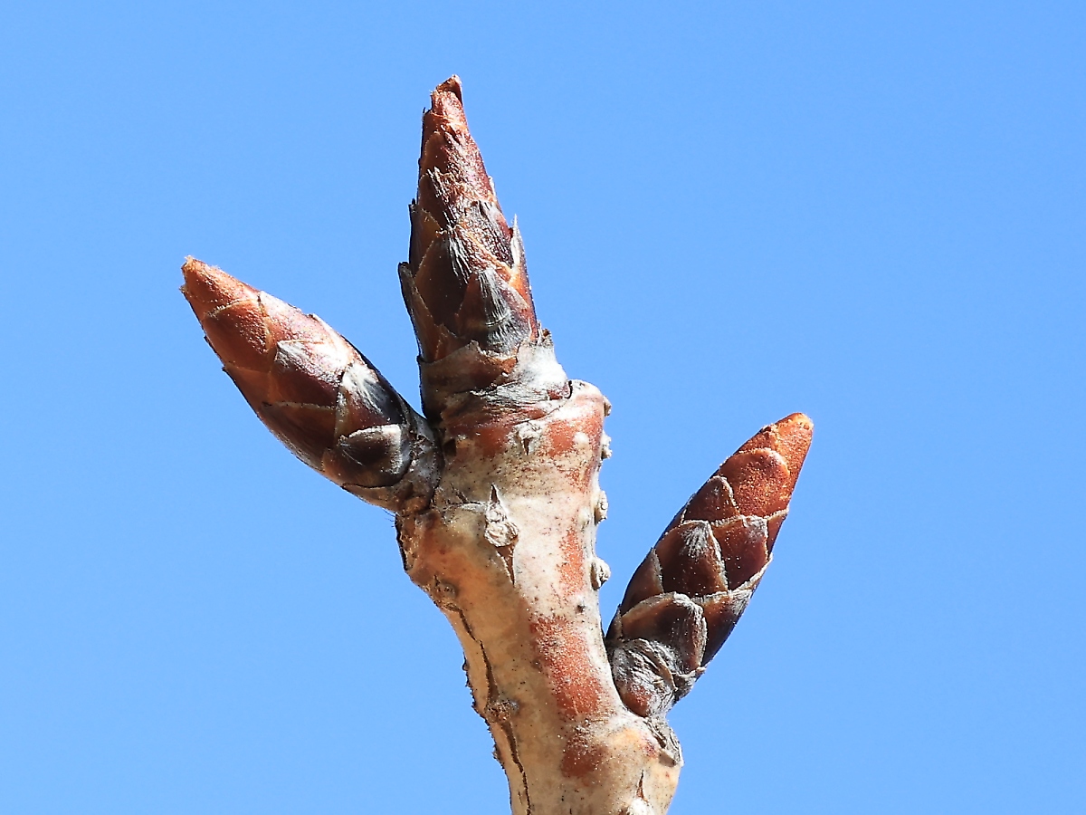 MEMO: 冬芽が伸びて長くなり、先端が少し 割れ始めてきており、膨らみ始めた状態です