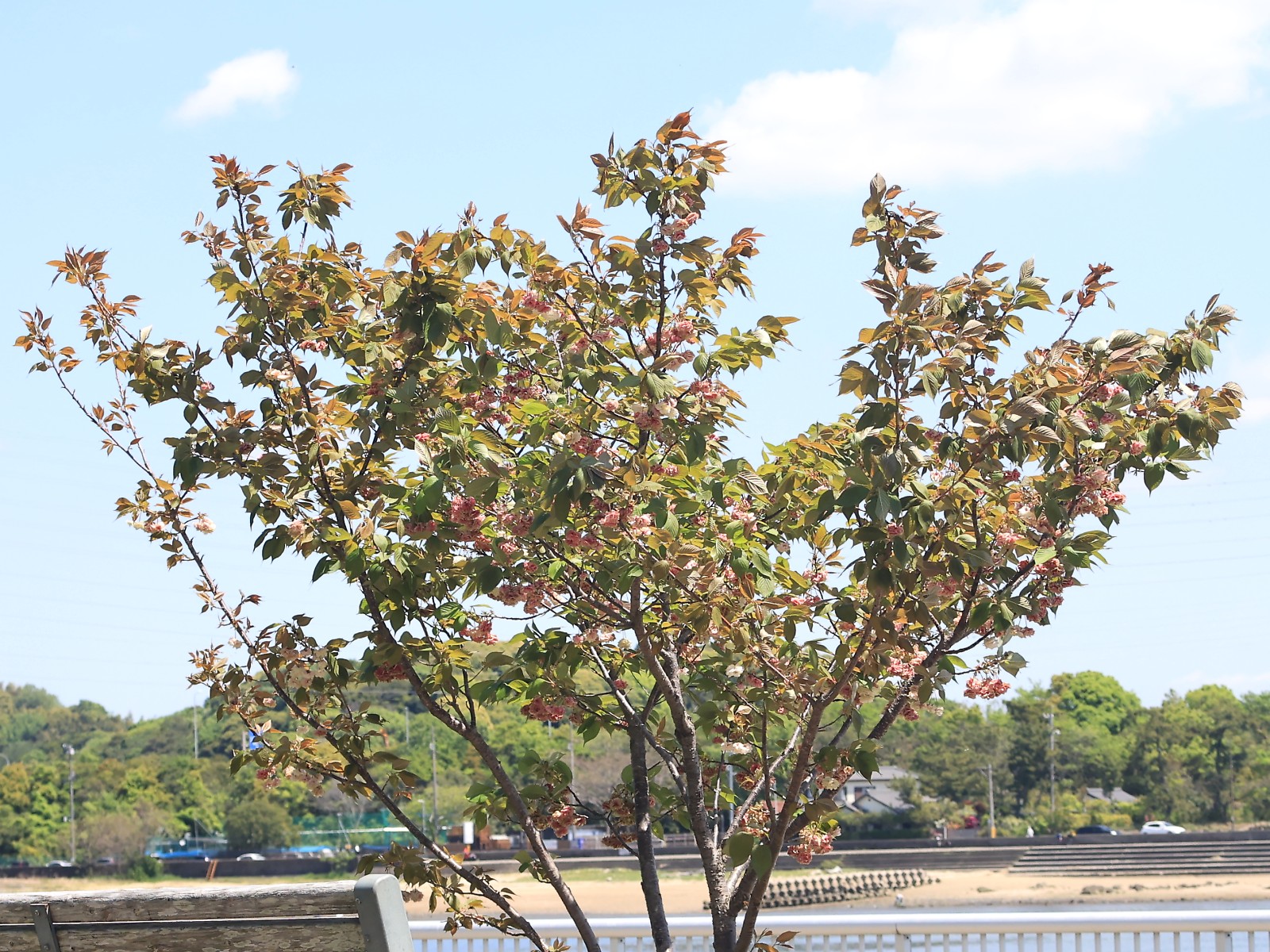MEMO: 散り始め時期を迎えた須磨浦普賢象の全体像で、 茶色や黄緑色の若葉が開いており、花が若葉に埋もれてしまって、 豪華だった姿はすっかり様変わりして、葉桜へと変わりつつある姿です