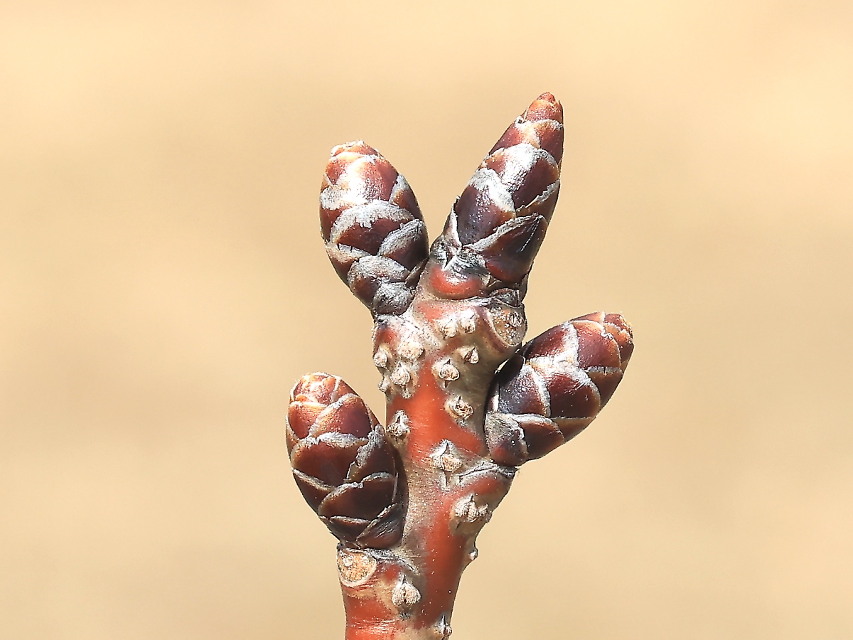 MEMO: 2月中旬の4月並みの高気温により、冬芽が少し 膨らみ、先端が割れてきており、冬芽が膨らみ始めた状態です