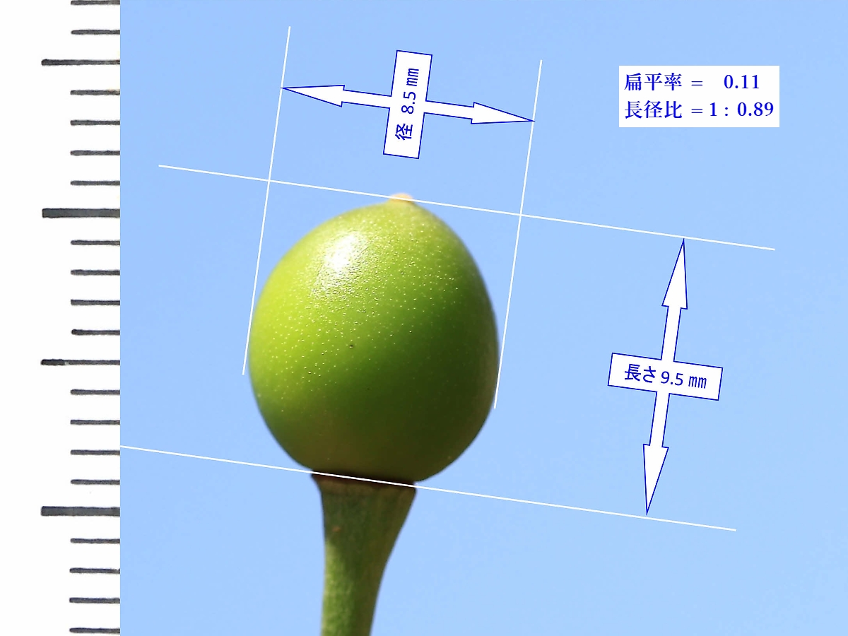 MEMO: 結実して間もない頃の駿河台匂の実の大きさを 計ったもので、長さが 9.5 ㎜で、径が 8.5 ㎜で、扁平率が 0.11 と まだ緑色の若い実の内からかなり丸みを帯びた実です