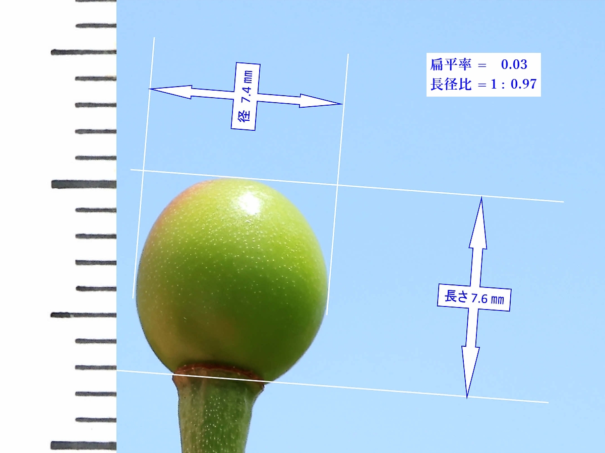 MEMO: 結実して約10日前後の駿河台匂の実の大きさを計ったもので、 長さが 7.6 ㎜で、径が 7.4 ㎜で、扁平率が 0.03 とまん丸で、緑色の若い 実のうちからまん丸な形が特徴で、この先どこまで熟すかが楽しみです