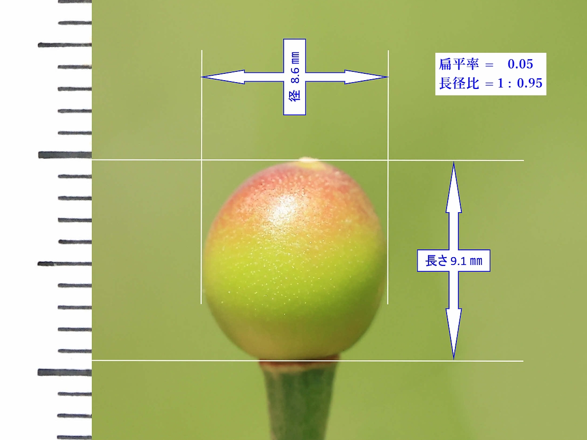 MEMO: 結実して約半月後の駿河台匂の実の大きさを計ったもので、 長さが 9.1 ㎜、径が 8.6 ㎜で、一回り大きくなり、扁平率も 0.05 と まん丸で、少し赤くなり始めたところで、この先どこまで熟すか楽しみです