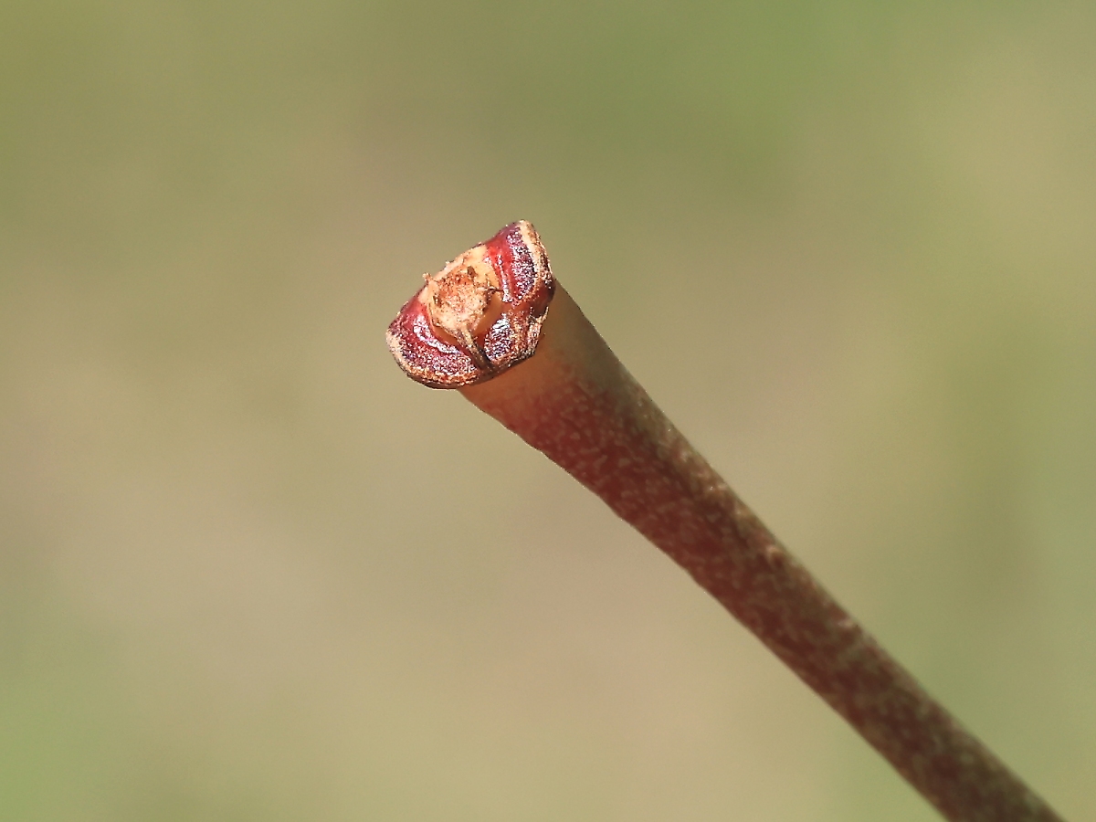 MEMO: 結実して約2ヶ月後の駿河台匂の双子の実が落果した痕跡の実柄で、 残念ながら双子の実は、完熟する前に落果してしまい完熟した実は見れなかった