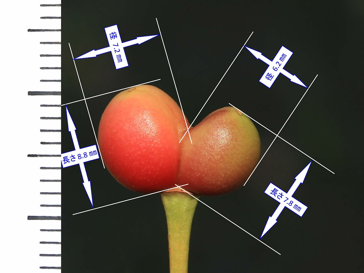 MEMO: 結実して約1ヶ月後の駿河台匂の親子の実の大きさを計ったもので、 長さが 8.8 と 7.8 ㎜、径が 7.2 と 6.2 ㎜で、2つ目の親子の実で、 両方とも赤く色づいており、この先どこまで熟すかが楽しみです