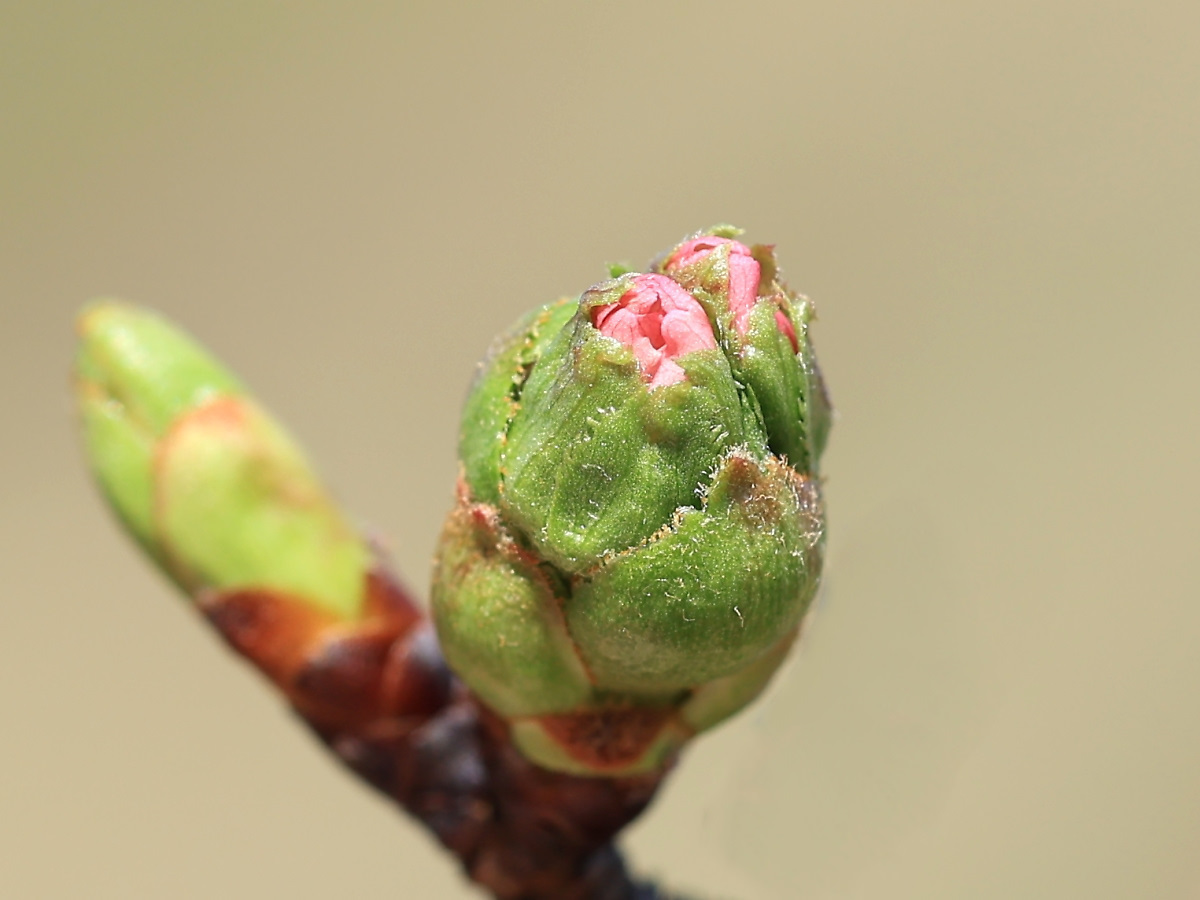 MEMO: 花芽の先端が割れ、中から蕾が3個出始めたところで、 蕾の先端からピンク色の花弁も顔を覗かせています
