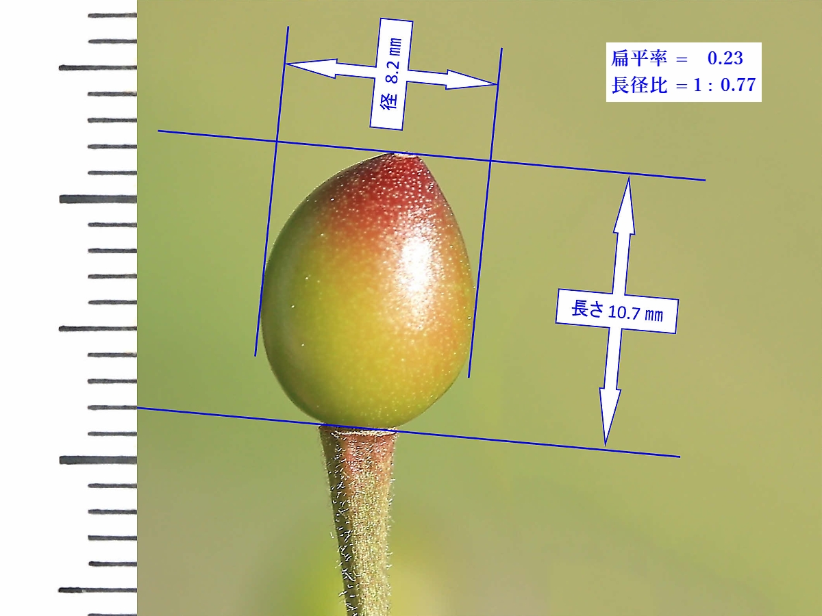 MEMO: 衣通姫の実の大きさを計ったもので、 長さが 10.7 ㎜で、径が 8.2 ㎜と一気に大きくなり、 扁平率も 0.23 と少し球形に近い形となってきた状態です