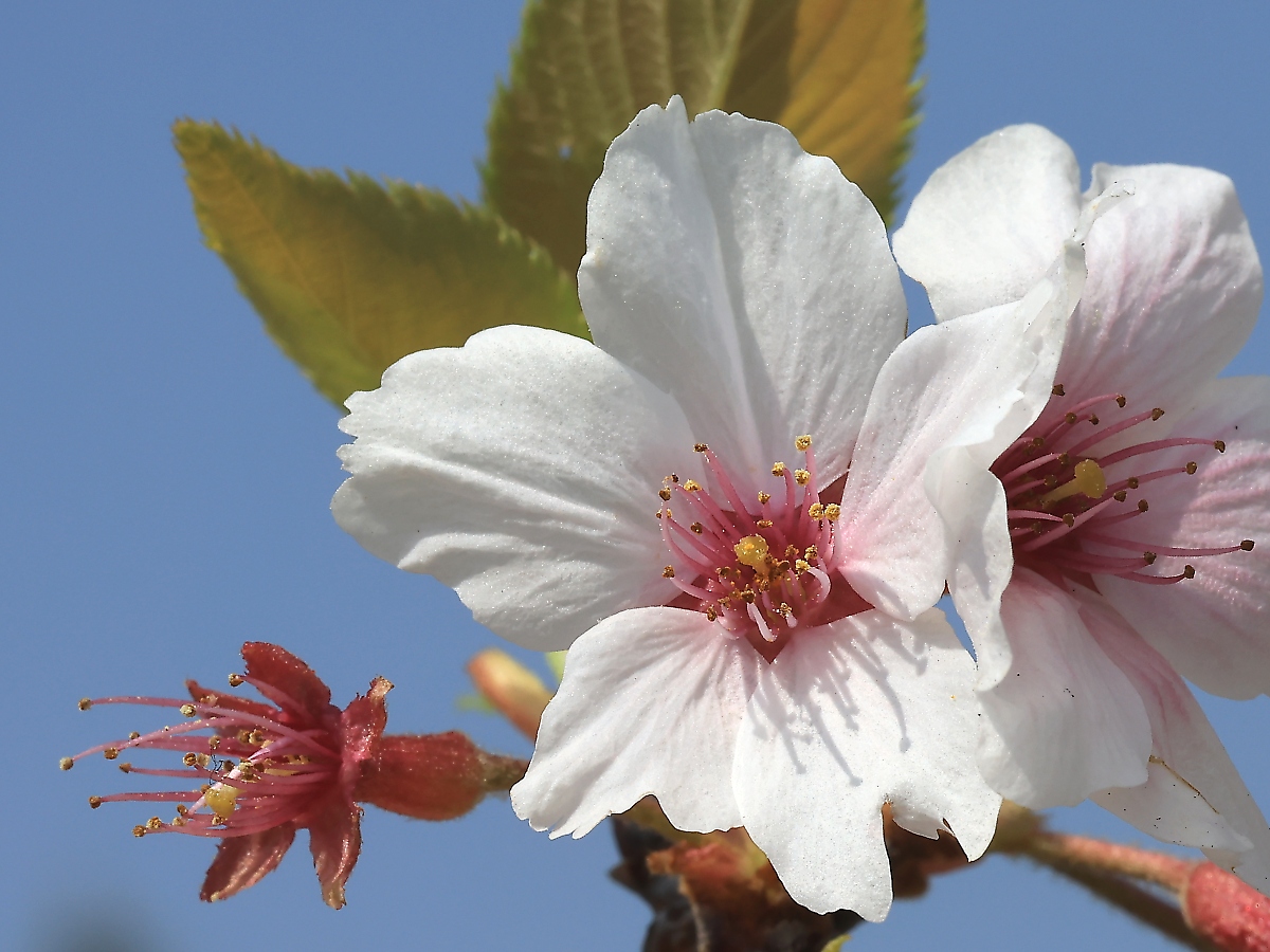 MEMO: 花時期も終わりが近づいた染井吉野で、花弁の中央が紅色に変わり、 雌しべ雄しべの花糸も淡紫色に変わってきており、花の最後の姿に変わりつつあります