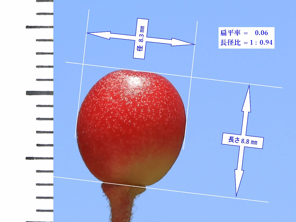 MEMO: 結実して約1ヶ月が過ぎた頃の染井吉野の実の大きさを 計ったもので、長さが 8.8 ㎜で、径が 8.3 ㎜で、扁平率が 0.06 と まん丸で、色も透き通った赤色で、完熟に近づいている状態です
