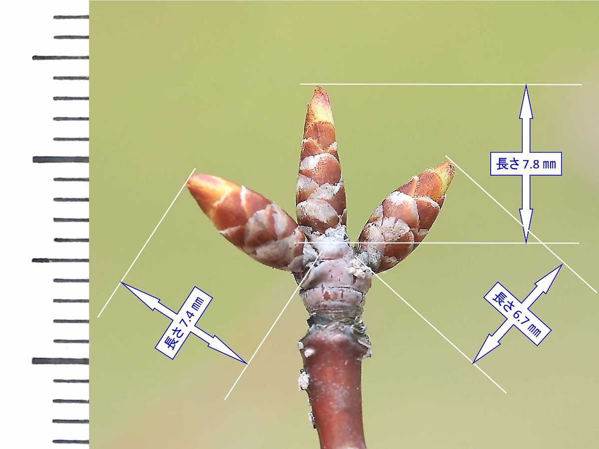 MEMO: 冬芽が膨らんできており、先端に黄緑色や紅色が見え始めた状態で、 その状態の冬芽の長さを計ったもので、長さは 6.7 ~ 7.8 ㎜と1㎝にも満たない 小さな冬芽で、左右のふっくらとしたのは花芽で中央の尖ったのは葉芽と思われます