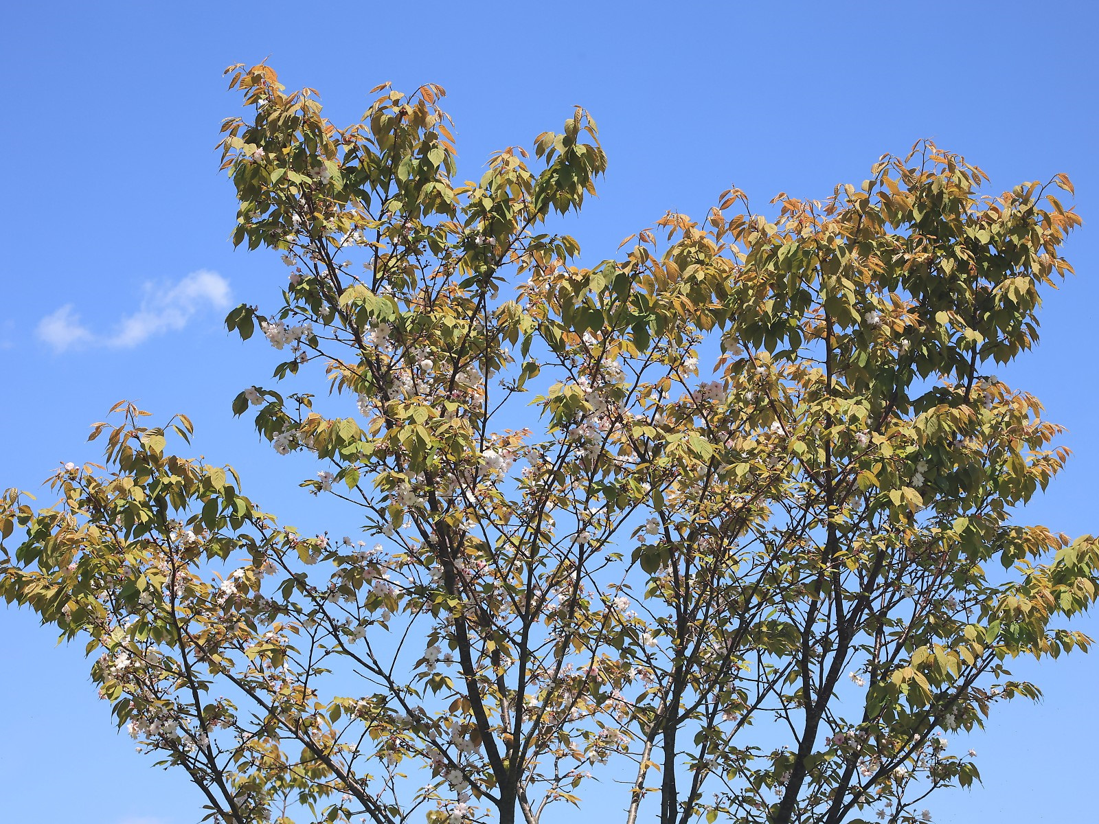 MEMO: 7分咲きの奈良の八重桜の全体像ですが、 茶色や黄緑色の若葉が茂ってきており、淡紅色の可憐な花は 葉に埋もれてしまって、遠くからでは華やかさが全く感じられません