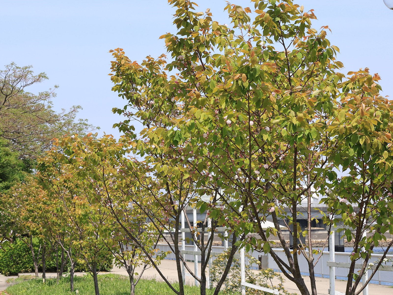MEMO: 満開時期を迎えた奈良の八重桜の全体像ですが、 見ての通り、茶色や黄緑色の若葉が茂ってきており、淡紅色の 可憐な花は葉に埋もれてしまって、満開時期かどうかわからない状態です