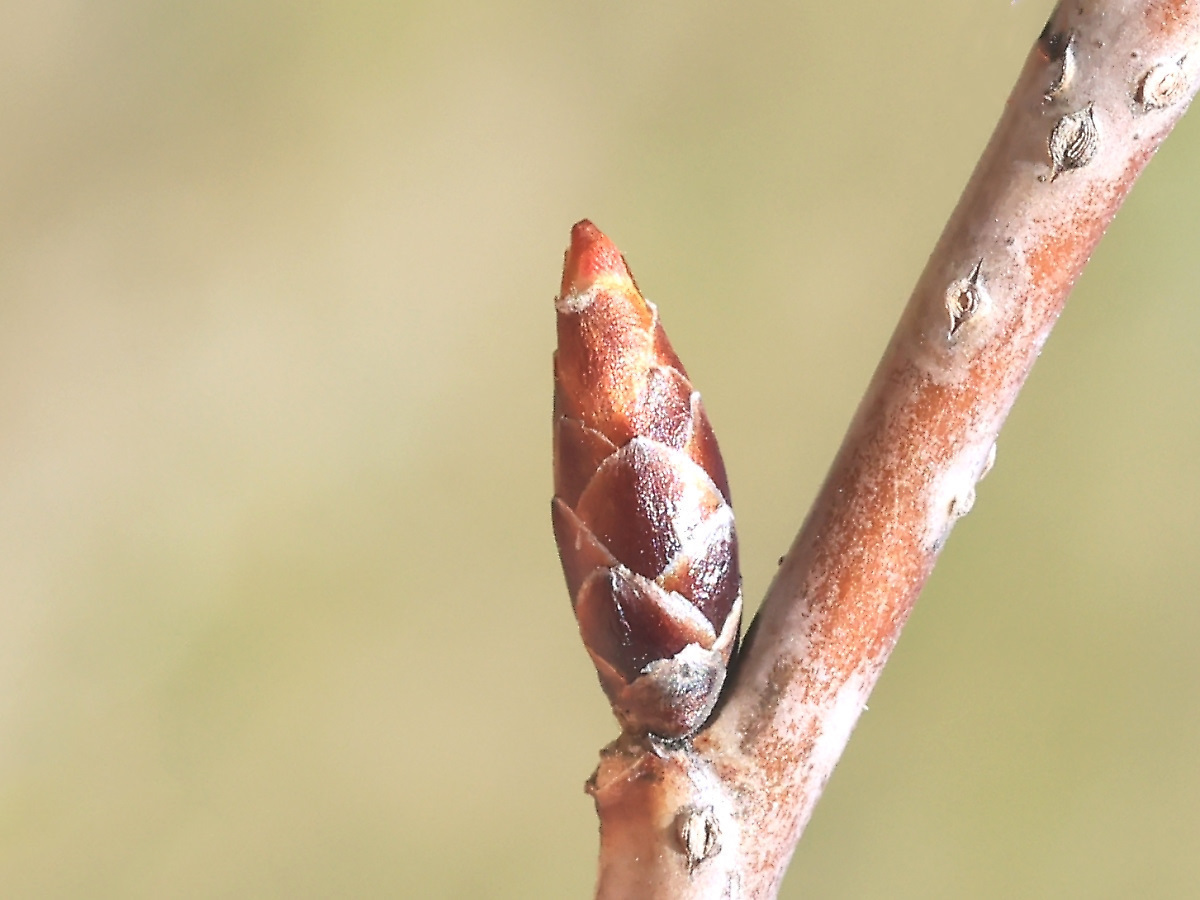 MEMO: 冬芽が伸びて長くなり、先端に紅色が 見え始めたところで、冬芽が膨らみ始めた状態です