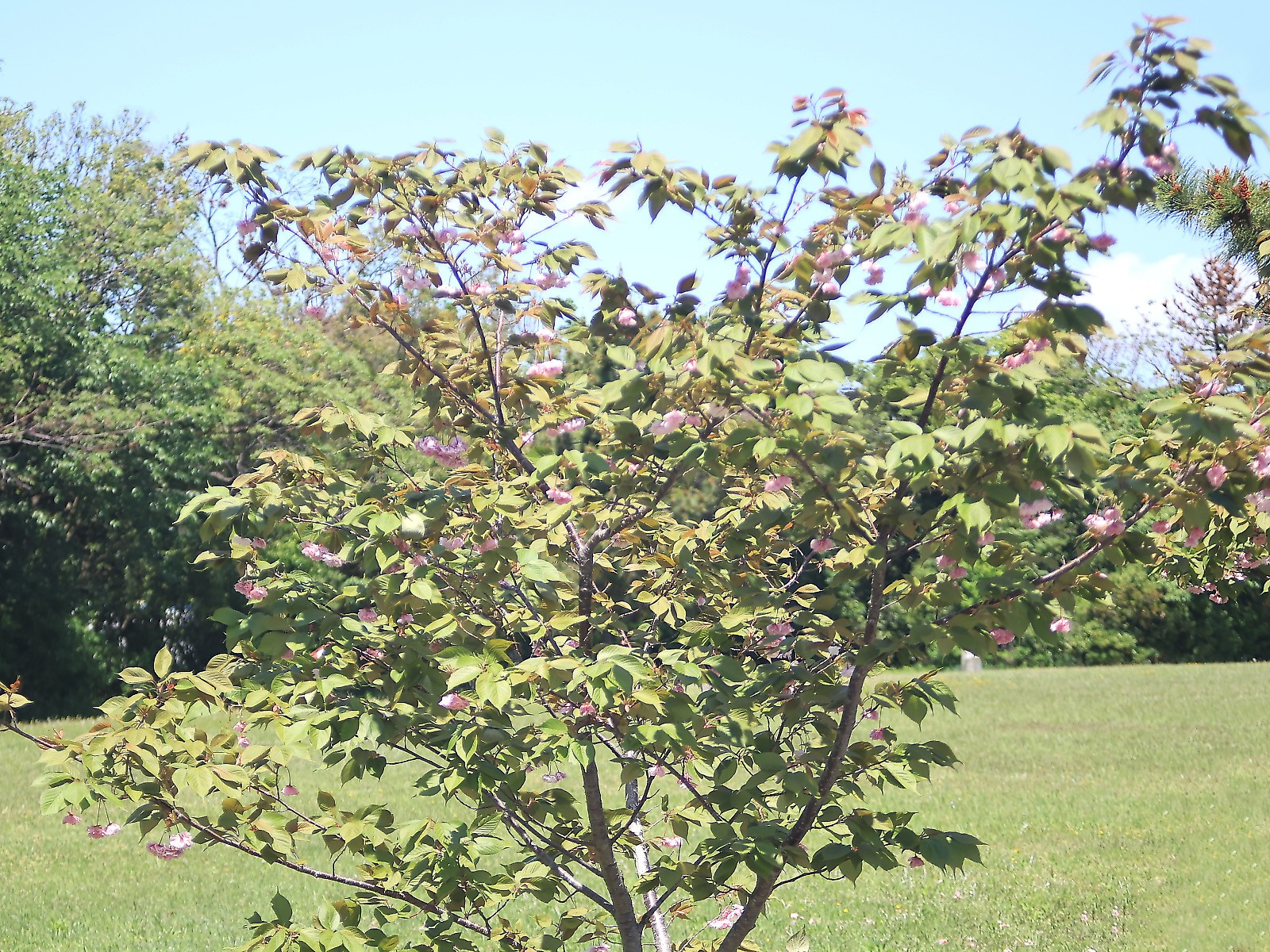 MEMO: 散り始め時期を迎えた普賢象の全体像で、黄緑色の若葉が開いており、 大輪の花も葉に埋もれてしまって華やかさは消え、葉桜へと変わりつつあります