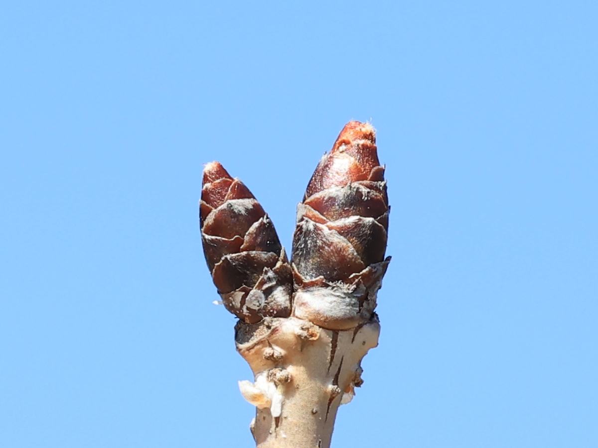 MEMO: 冬桜の春咲きの冬芽で、2月中旬の高気温で少し膨らみ 始めたようで、先端が少し伸びて黄緑色が見えかけている状態です