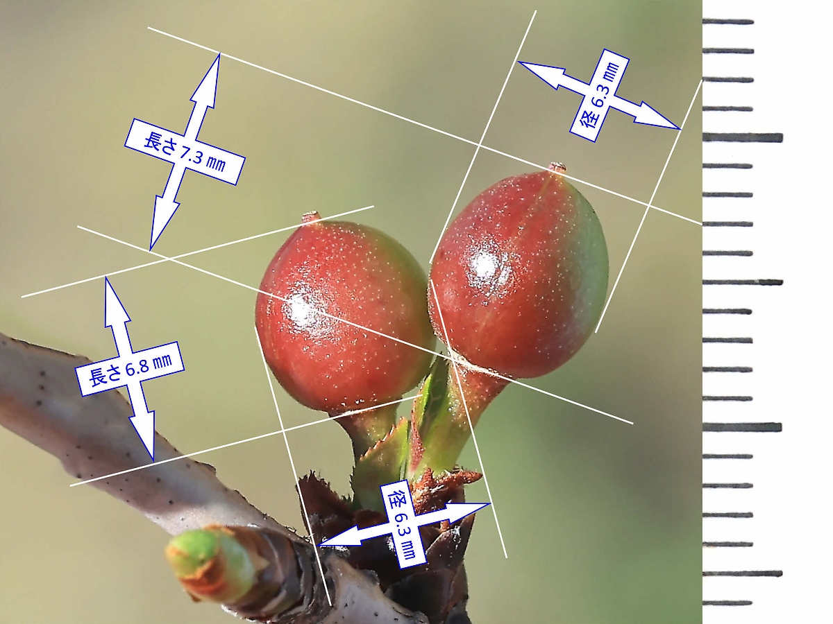 MEMO: 秋先の実の大きさを計ったもので、長さが 6.8 ~ 7.3 ㎜で、径が と、 この状態でかなり球形に近く、この先どこまで熟すか、大いに期待するところです