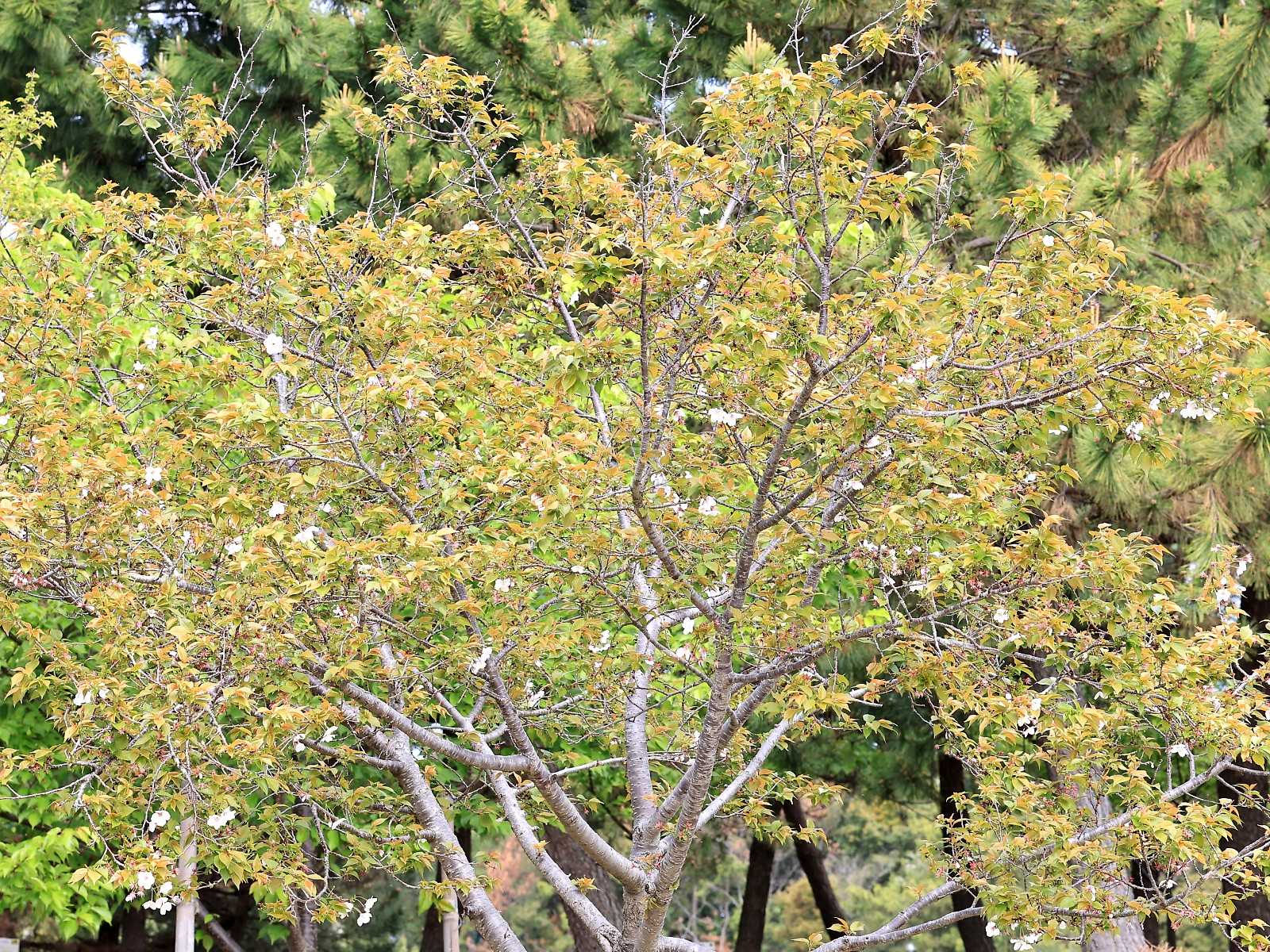 MEMO: 花時期の終了時期を迎えた冬桜で、茶色がかった黄緑色の若葉が広がり、 このように葉桜に向かいつつある姿に変わりつつある状態です