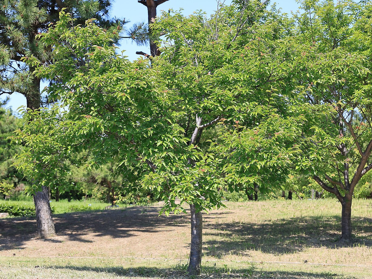 MEMO: 植栽9年目の冬桜で、樹形は傘状で、樹高は 2.5 mで、 植栽9年目で3m弱と、当公園では普通の成長状態です