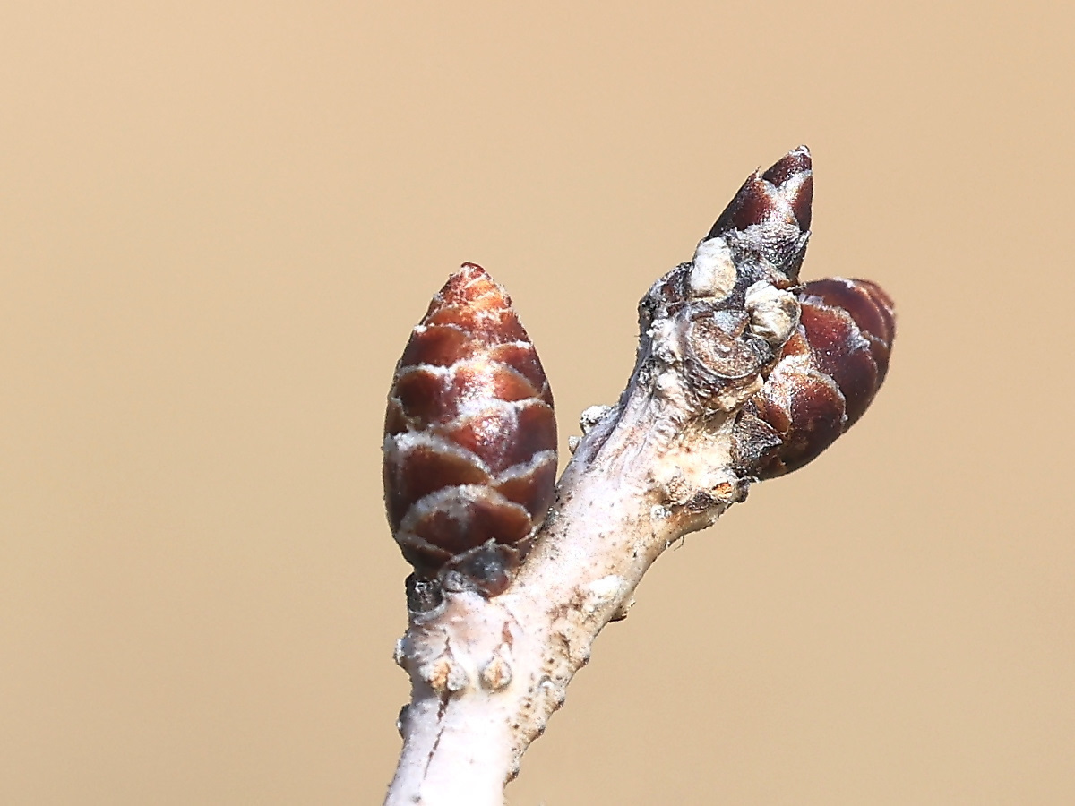MEMO: 冬芽が膨らみ、左の花芽と思われる冬芽は 先端に黄緑色と弁色が見え始めている状態です