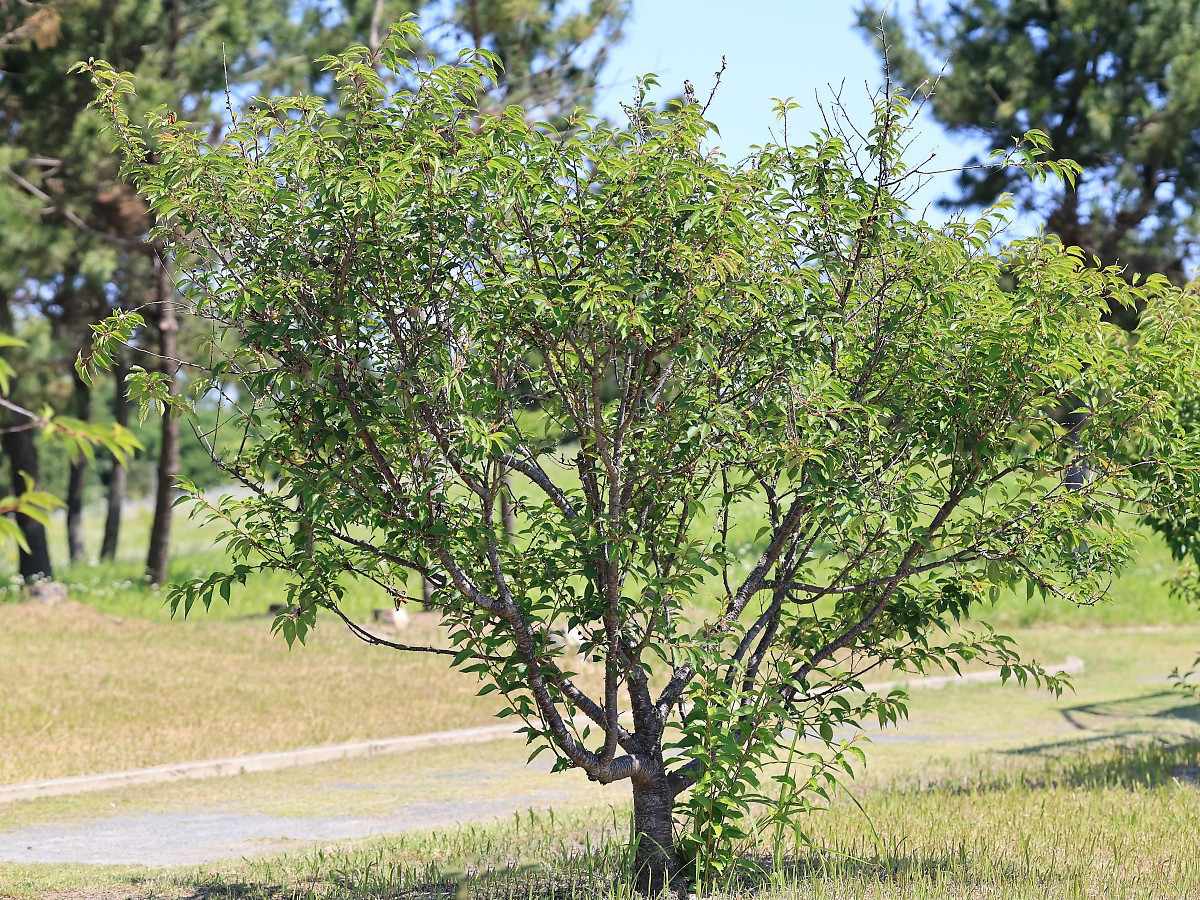 MEMO: 植栽9年目の豆桜で、樹形は広卵状で、樹高は 2.1 mと 植栽9年目にしてはやや成長が鈍いが、若木のうちから花付きは非常に良い なお、豆桜は落葉低木(5m以下)ですので、これ以上はあまり成長しない