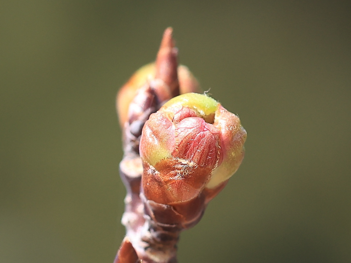 MEMO: 花芽の膨らみが更に増し、先端が割れて、蕾が3個程度 顔を覗かせており、蕾が出始めるのが近づいてきた状態です