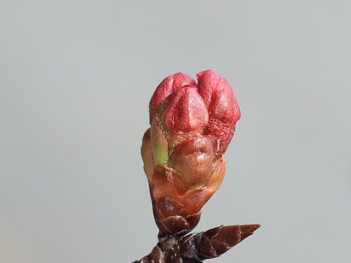 MEMO: 花芽の膨らみが更に増し、先端が割れて、 蕾が3個出始めた状態で、雅は蕾のうちから紅色をしています