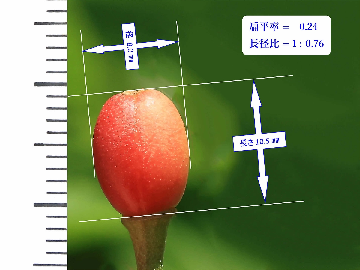 MEMO: 結実してから約1ヶ月後の雅の実の大きさを計ったもので、 長さが 10.5 ㎜、径が 8.0 ㎜で、大きさは変わっていないが、 全体が赤くなってきており、完熟に近づいている状態です